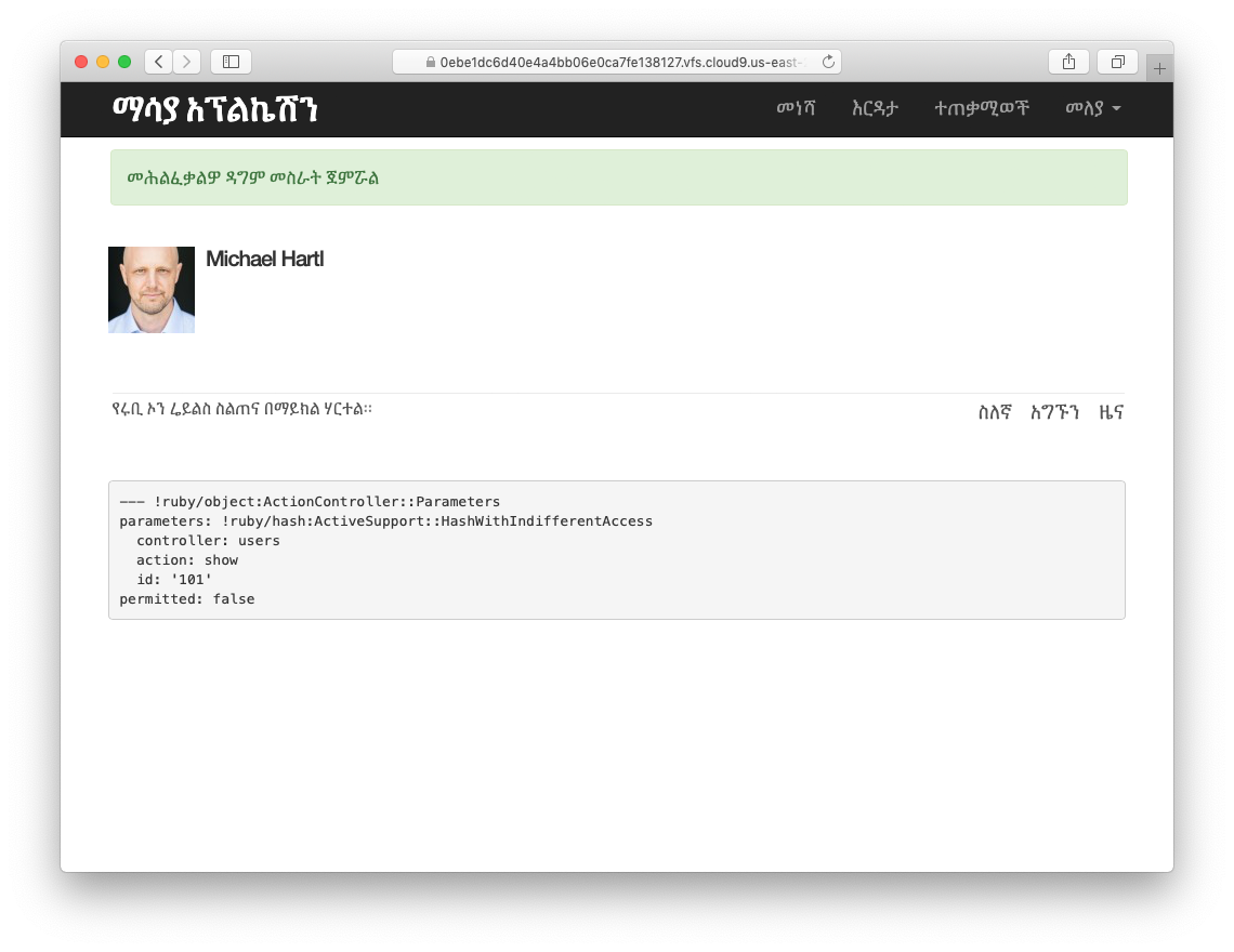 አፕልኬሽናችሁ በሃረኩ ላይ ከተሰማራ በኋላ “መሕለፈቃልወን ረሱ” የሚለውን አገናኝ ላይ ጠቅ በማድረግ (ምስል 12.4) መሕለፈቃላችሁን ዳግም ማስጀመር ትችላላችሁ፡፡ ውጤቱ በምስል 12.14 ላይ እንደሚታየው፣ አንድ የዳግም ማስጀመሪያ ኤመልእክት መሆን አለበት፡፡ አገናኙን መከተል እና ብቁ ወይም ብቁ ያልሆኑ ርክቦችን ማስረከቡ፣ ልክ በማበልጸግ ላይ እንደሰሩት ሁሉ በምርቱ ላይም እንደዛው መስራት አለባቸው (ምስል 12.12 እና ምስል 12.13)፡፡ በተመሳሳይም፣ ተጠቃሚው መሕለፈቃሉን በተሳካ ሁኔታ ሲቀይር፣ ወደ መገለጫ ገጹ መዟዟር ይኖርበታል (ምስል 12.15)፡፡